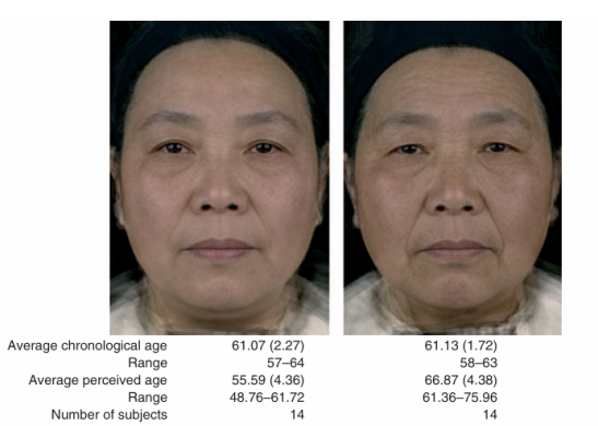 圖6 實際平均年齡為61歲的面部合成圖像。圖像由被判定為看起來比實際年齡更年輕或更年長的女性群體合成而成。左側展示了一組14名被判定為看起來比實際年齡更年輕的女性的合成圖像,右側展示了一組14名被判定為看起來比實際年齡更年長的女性的合成圖像