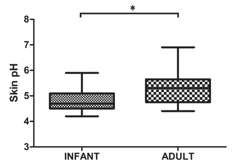 圖2 嬰兒在上臂內側的皮膚表面pH值顯著低于成人