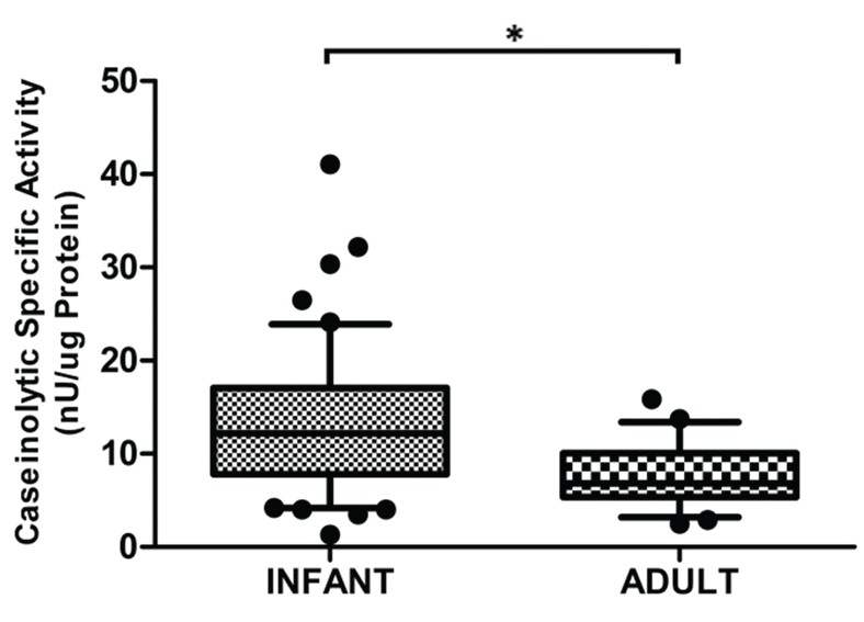 圖3 嬰兒皮膚的酪蛋白水解特異性活性高于成人皮膚